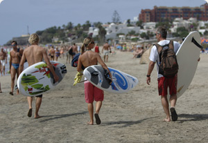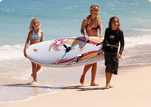 Lässig mit kleinem Board unterm Arm über den Strand schlendern. Darauf solltet ihr achten: Finnen innen - das minimiert die Gefahr bei unbeabsichtigten Kollisionen